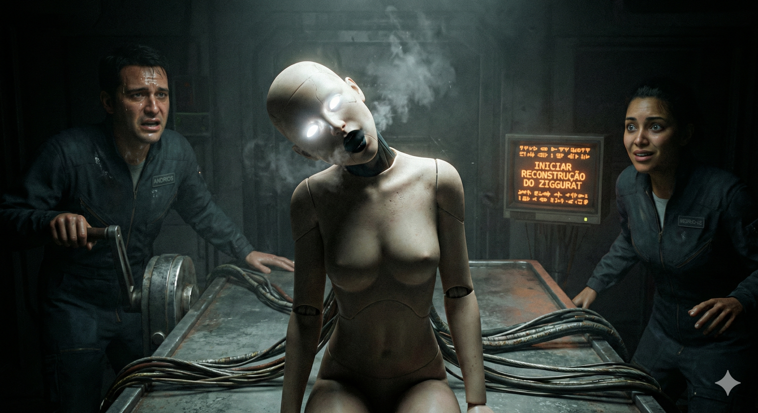 De repente, os monitores na sala piscaram. O corpo de Bea-8, que deveria estar desligado, convulsionou na mesa de exame.