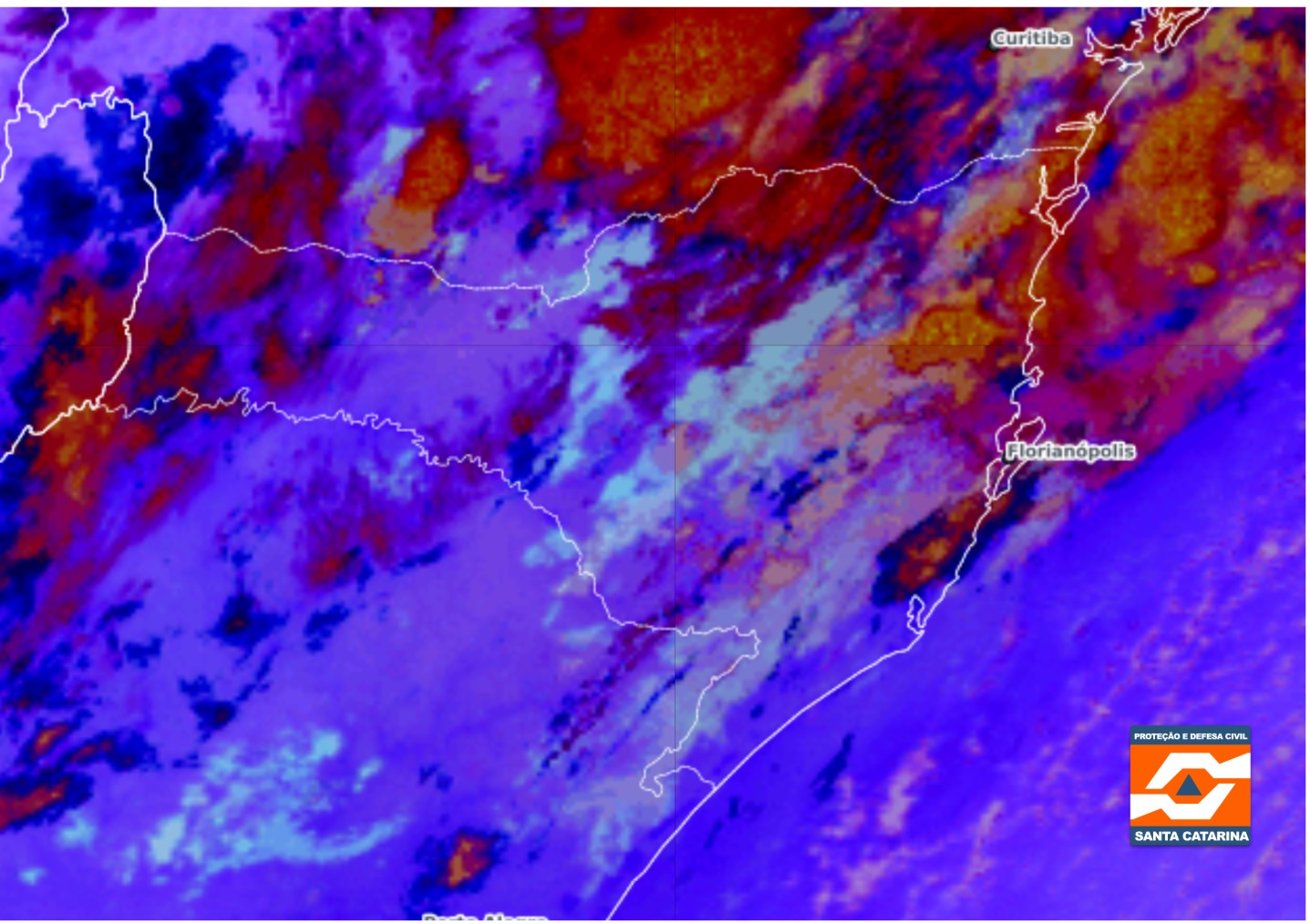 Figura: Imagem do satélite GOES-19, produto Nighttime Microphysics, às 22h20, horário local. Fonte: DSAT/CPTEC, adaptado por SDC/SC.