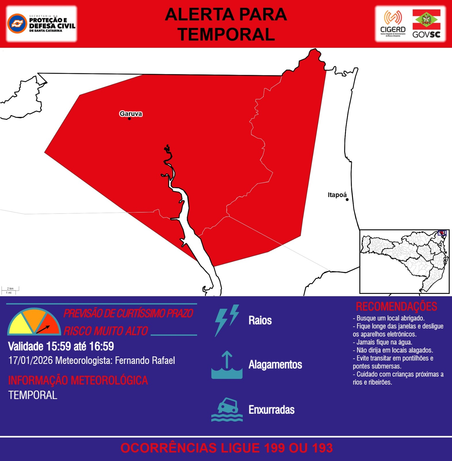 ALERTA – 17/01 15:59 – TEMPORAL com RAIOS, ALAGAMENTOS e risco de ENXURRADAS para os municípios de Garuva, Itapoá, Joinville e São Francisco do Sul na próxima hora. Ocorrências ligue 199 ou 193.