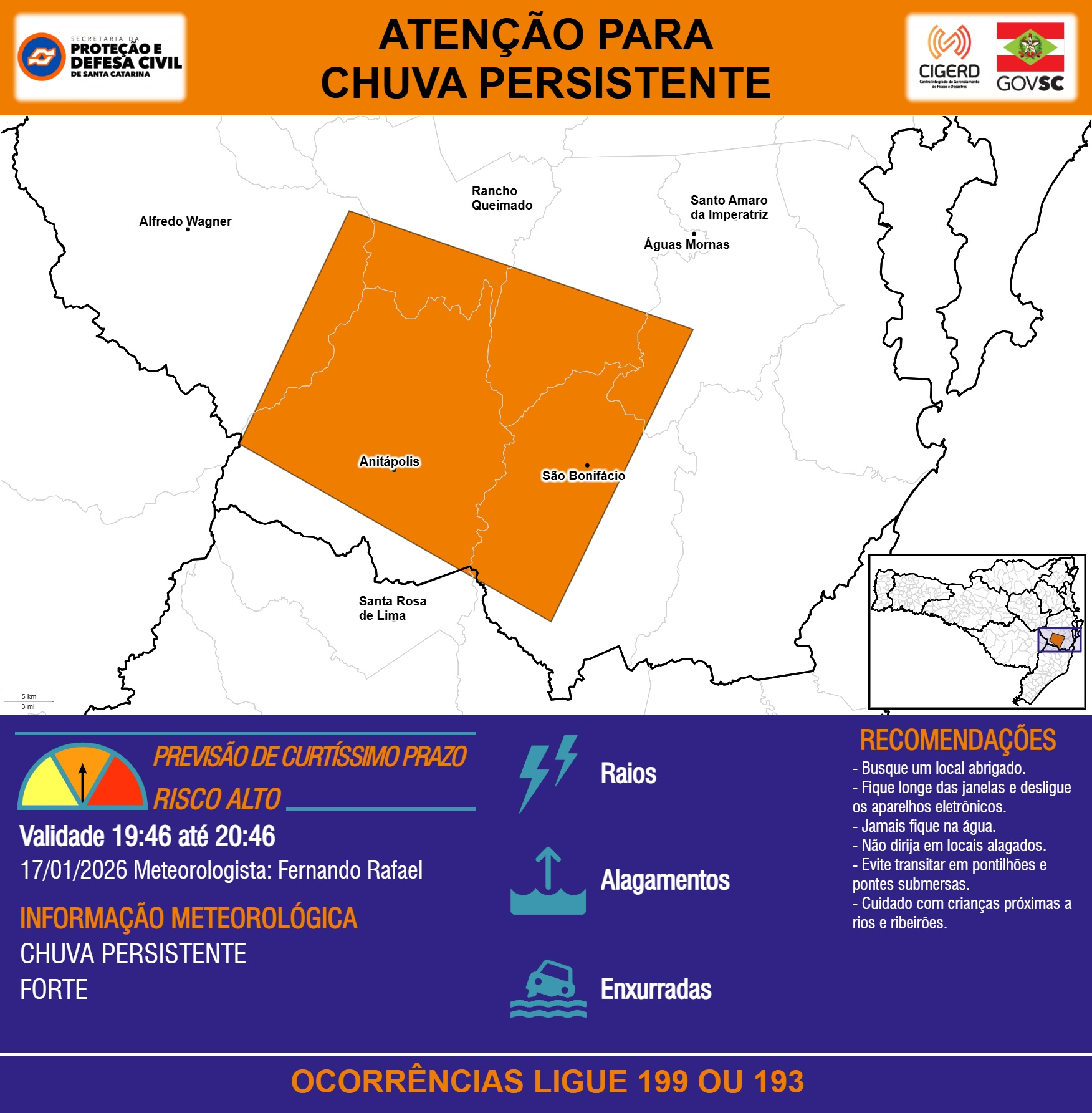 ATENÇÃO – 17/01 19:46 – CHUVA PERSISTENTE de intensidade forte com RAIOS, ALAGAMENTOS e risco de ENXURRADAS para os municípios de Alfredo Wagner, Anitápolis, Rancho Queimado, Santa Rosa de Lima, Santo Amaro da Imperatriz, São Bonifácio, São Martinho e Águas Mornas na próxima hora. Ocorrências ligue 199 ou 193.