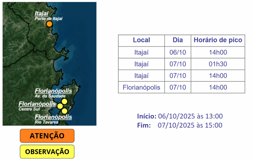 A partir da tarde desta segunda-feira (06), se mantendo até a tarde da terça (07), a atuação do vento sul persistente, somado à maré asreonôomica alta, favorece condições para registro de alagamentos costeiros em Florianópolis e Itajaí. O risco é moderado a alto para ocorrências associadas.