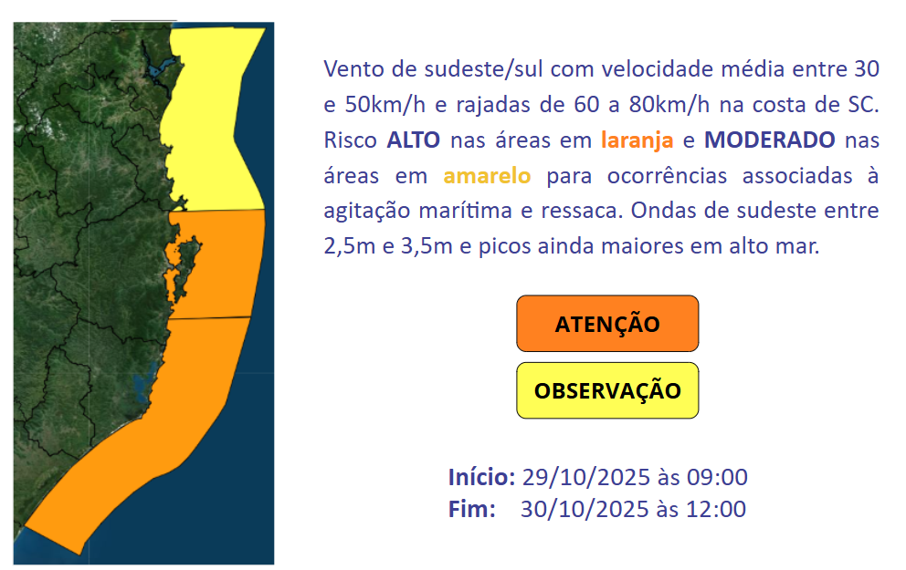 Ao longo desta quarta (29) e em boa parte da quinta-feira (30), o mar permanece agitado em todo o litoral catarinense, com ondas de direção sudeste, entre 2,5 e 3,5m e picos maiores em alto mar. As ondas atingem seu pico entre a tarde e noite desta quarta e começam a diminuir gradativamente entre a madrugada e manhã de quinta-feira. O risco é moderado a alto para ocorrências associadas à agitação marítima e ressaca.