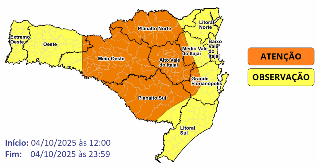 As instabilidades mais intensas são esperadas na metade leste do estado, sobretudo entre o Meio-Oeste, Planaltos e Alto Vale do Itajaí.