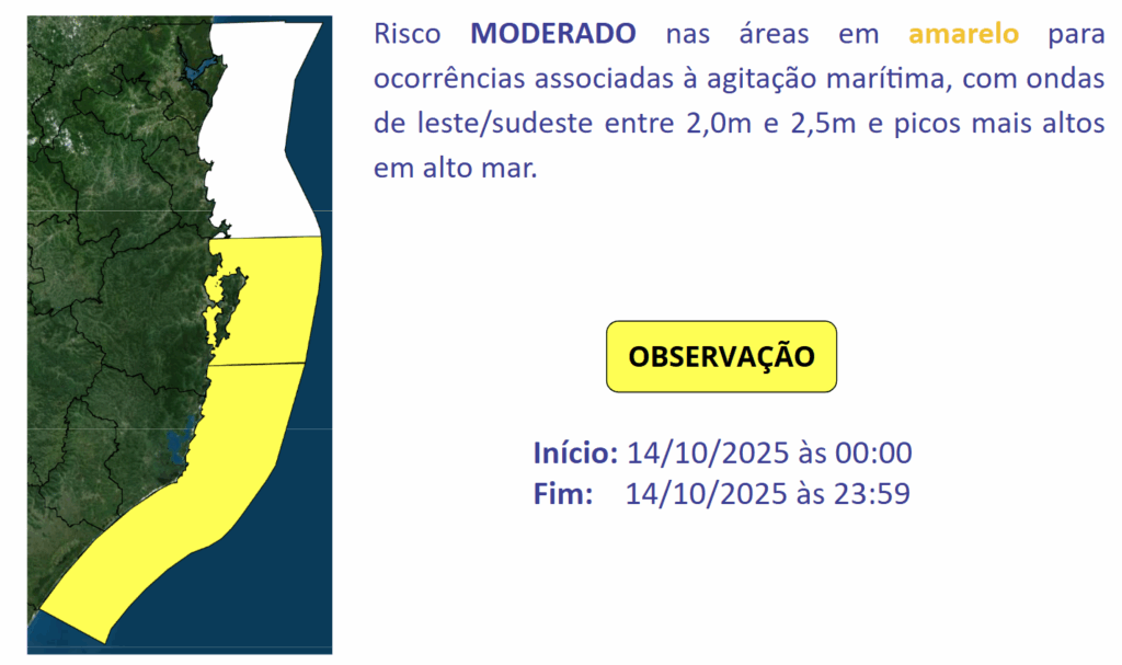 Nesta terça-feira (14), há condições para agitação marítima entre a Grande Florianópolis e Litoral Sul, trazendo risco moderado para ocorrências relacionadas a atividades de pesca e navegação, esportes náuticos e erosão costeira.