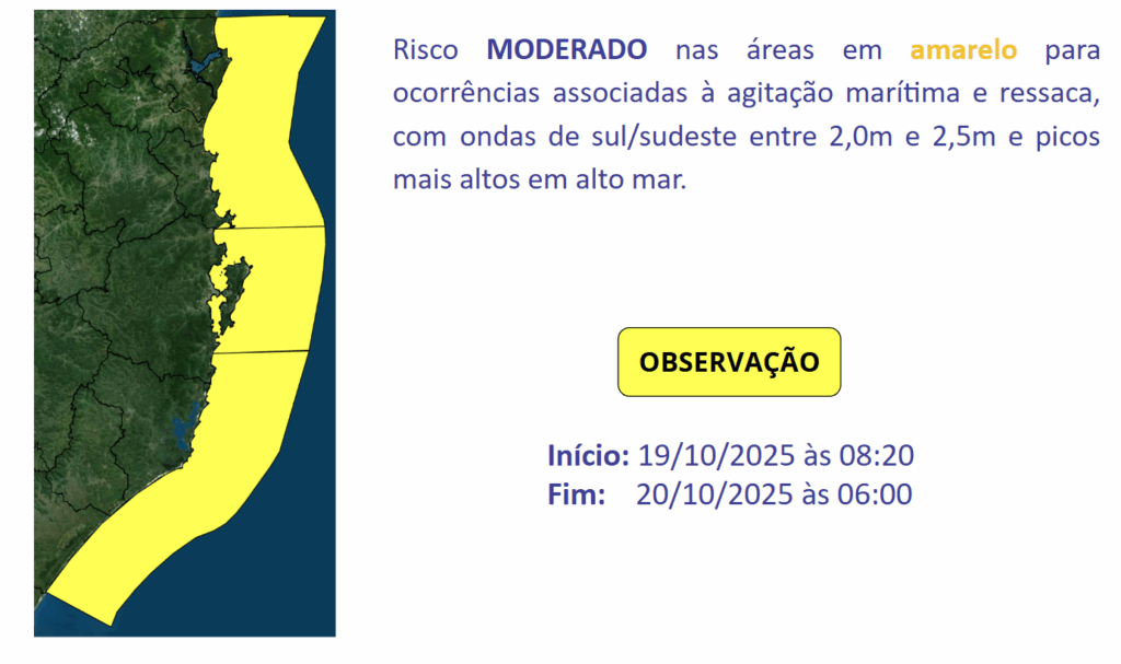 Ao longo desse domingo (19) e na madrugada de segunda (19), o vento sul segue apresentando moderada intensidade, o que favorece a manutenção das condições de agitação marítima em toda costa catarinense, trazendo risco moderado para ocorrências relacionadas a atividades de pesca e navegação, esportes náuticos e erosão costeira.