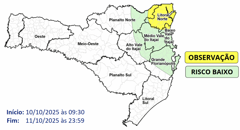 Entre esta sexta-feira (10) e o sábado (11), a combinação de áreas de baixa pressão (cavados) em diferentes níveis da atmosfera e a circulação marítima, mantém a condição de tempo mais encoberto e chuva fraca/moderada e persistente entre o norte e nordeste do leste catarinense, oferecendo risco baixo a pontualmente moderado para ocorrências relacionadas à alagamentos.