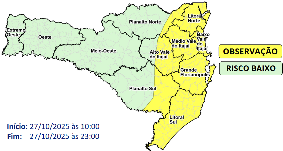 Nesta segunda-feira (27), a presença de instabilidades do centro ao leste catarinense, mantém o tempo com chuva persistente no litoral, Vale do Itajaí e Planaltos. Nessas regiões, o risco é moderado para alagamentos, especialmente em alguns locais onde a chuva pode ser mais intensa de maneira localizada.